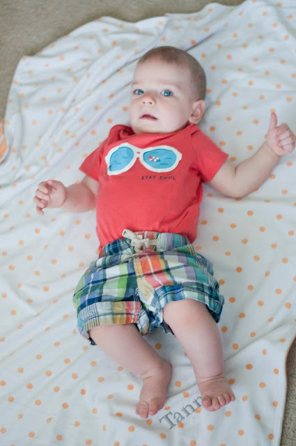 Physical Milestones: This month, Tanner has learned to army crawl all over the place, sit up unsupported and move from sitting to belly. He is really getting the hang of moving around to wear he wants to be. He love to move his hands and try to imitate. And he loves to push all the buttons on the baby toys that make a BUNCH of noise. :)